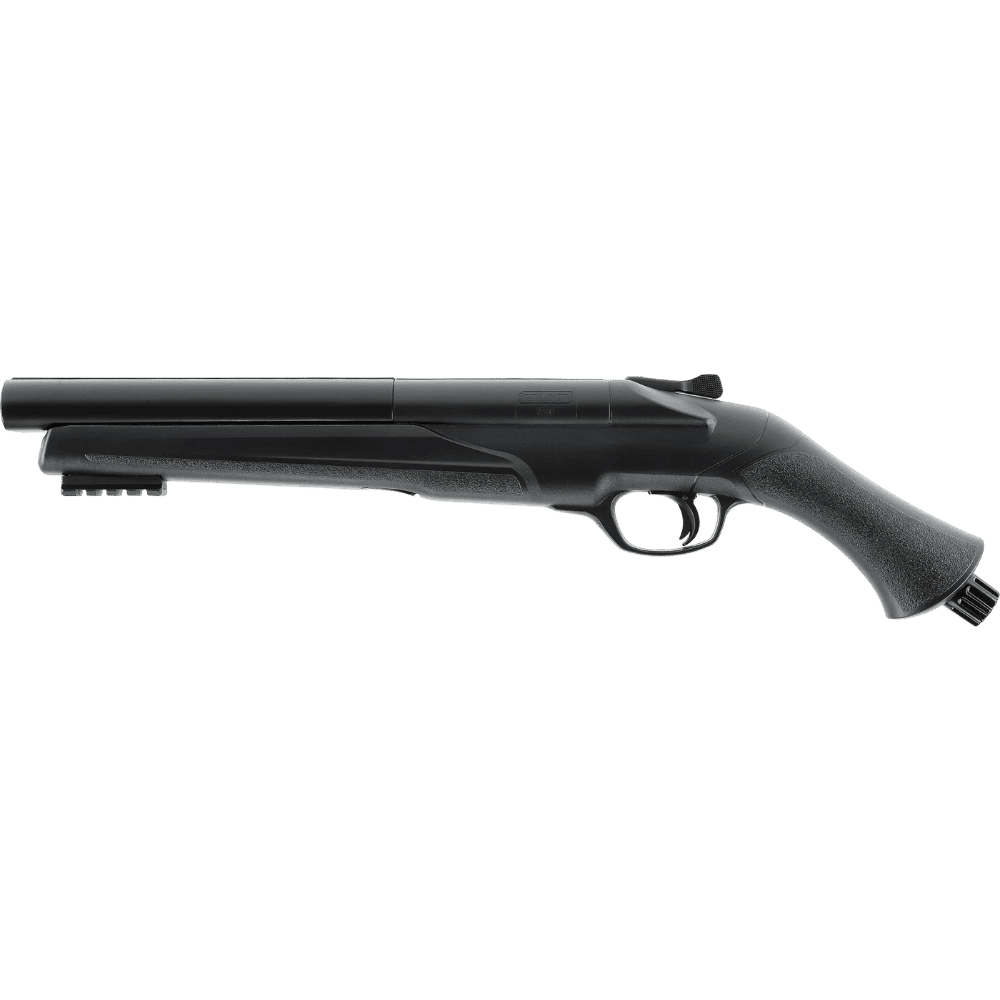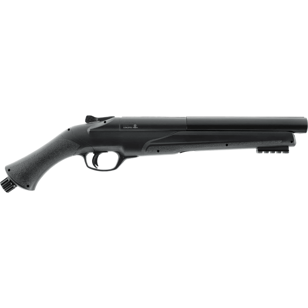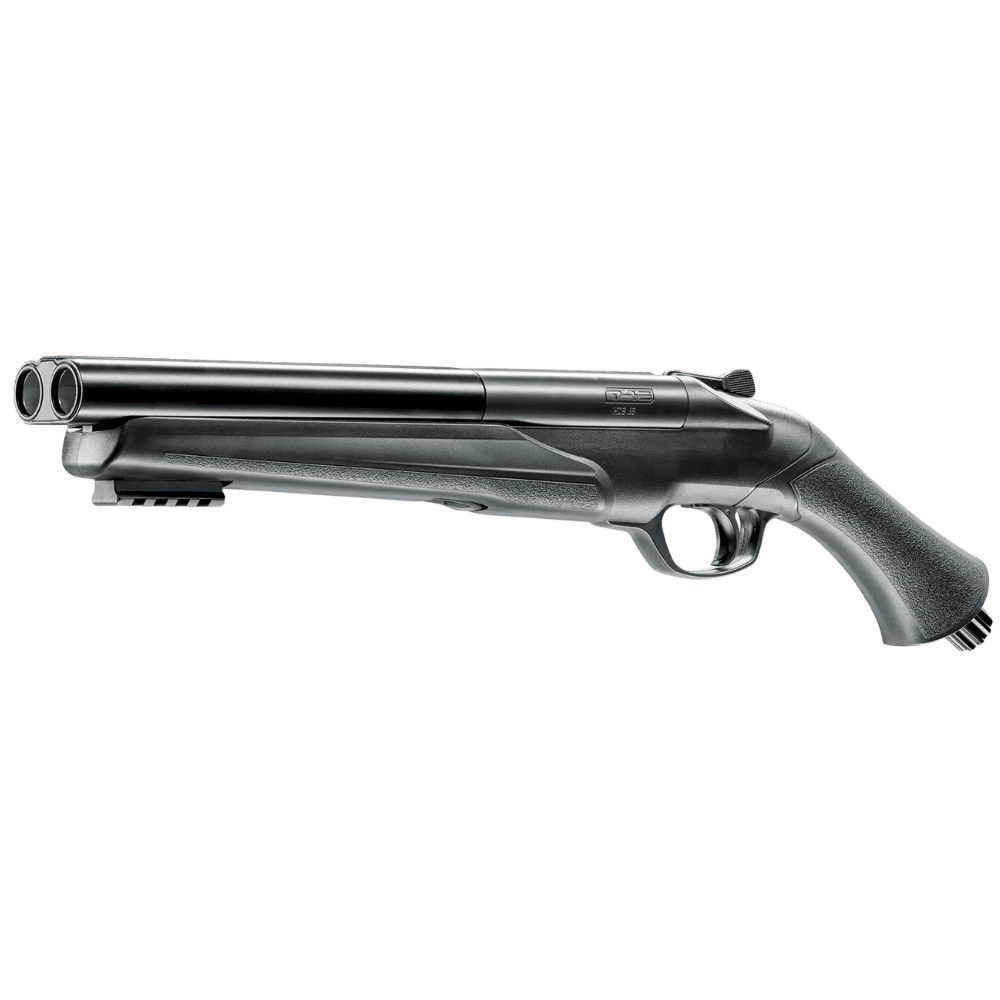 Escopeta táctica dos cañones HDS.68 Con un ligero golpe en la parte inferior de la empuñadura, puede perforar la cápsula de CO₂ cuando la ocasión lo requiera, y el indicador de presión óptico y táctil le indicará que está listo para disparar. La  Escopeta táctica dos cañones HDS.68 incluye un riel Picatinny bajo el cañón. Su gran calibre .68 permite usar la gama completa de munición T4E en calibre .68 (balas redondas y de precisión), que pueden dispararse individualmente o simultáneamente desde ambos cañones.