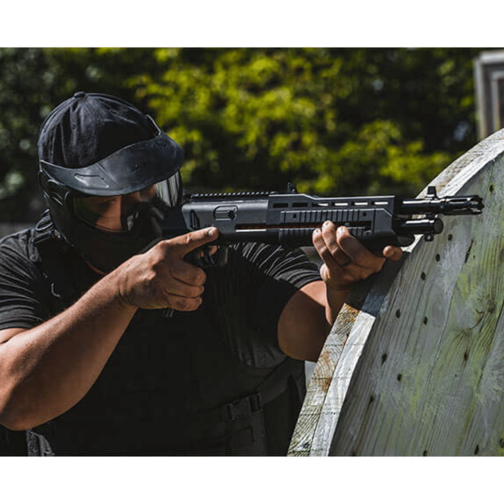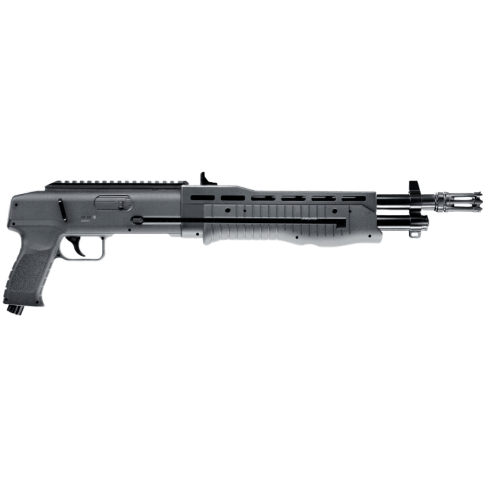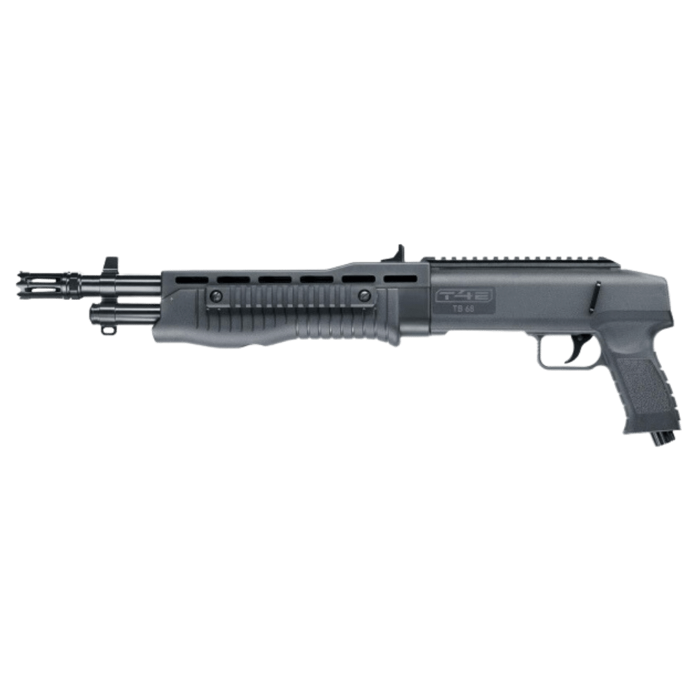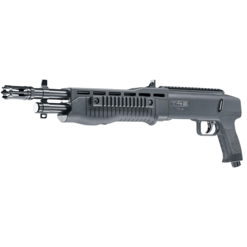 Escopeta TB Cal. 68 Umarex El potente T4E Tactical Blaster TB 68 calibre .68 garantiza un manejo seguro y fácil. El gatillo de doble acción permite disparar rápidamente dieciséis perdigones calibre .68. Los rieles Picatinny te permiten montar ayudas para apuntar y otros accesorios