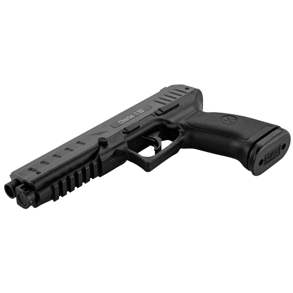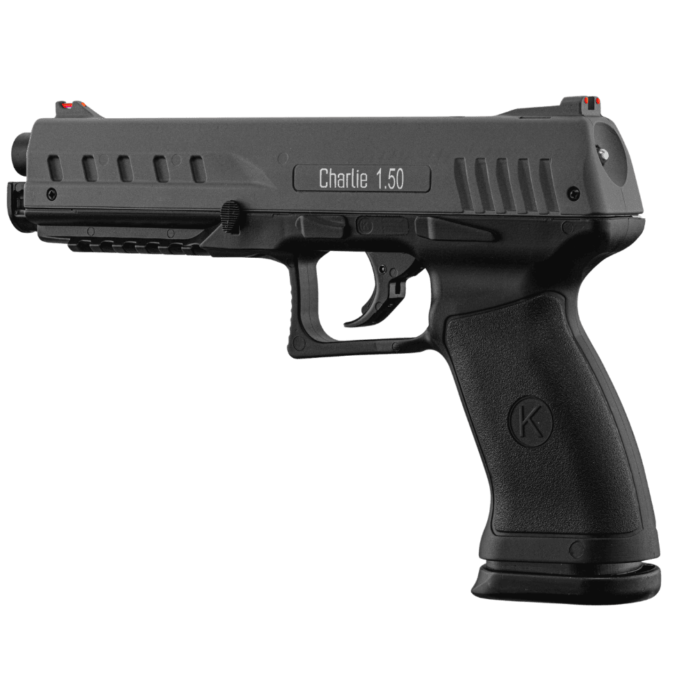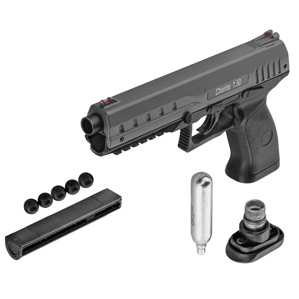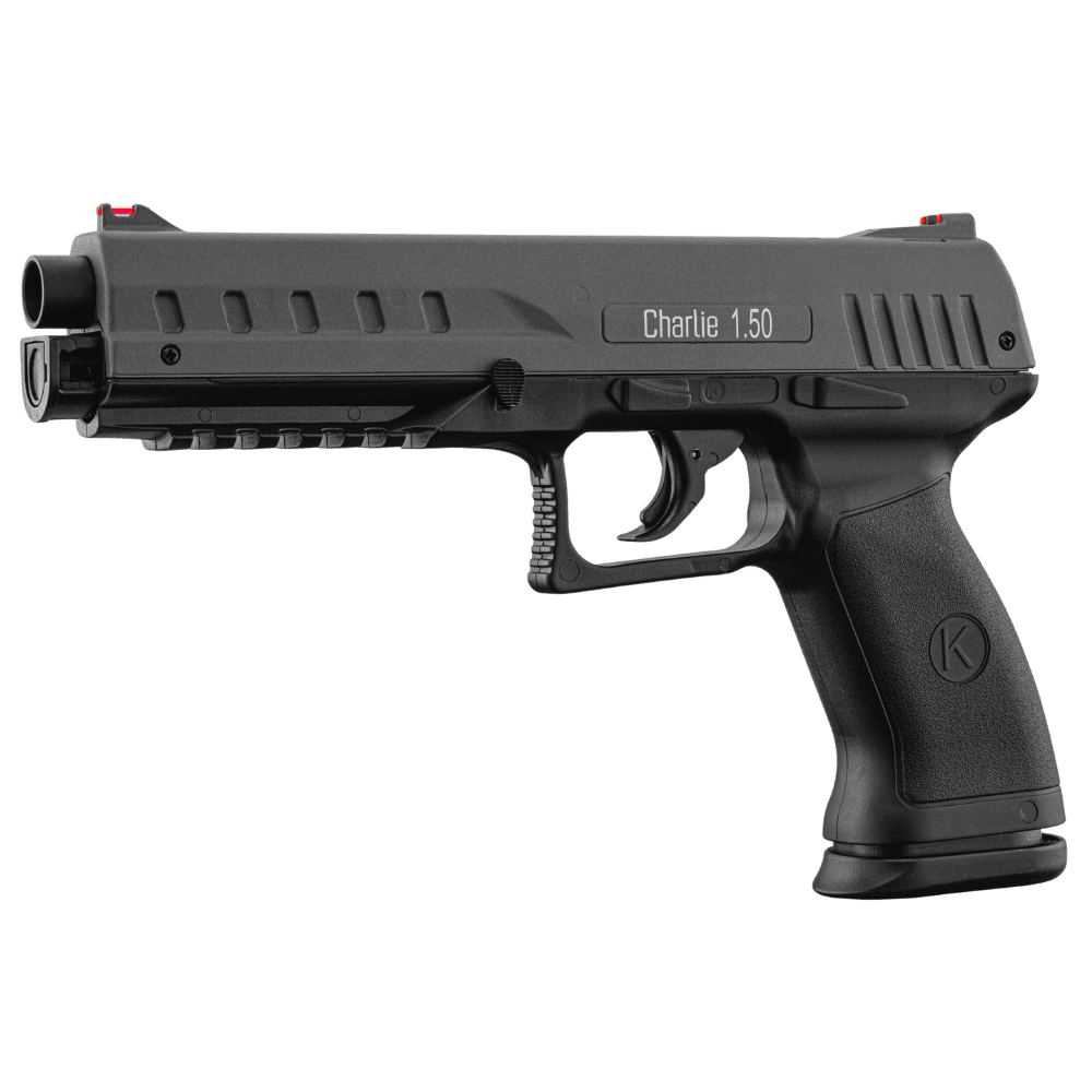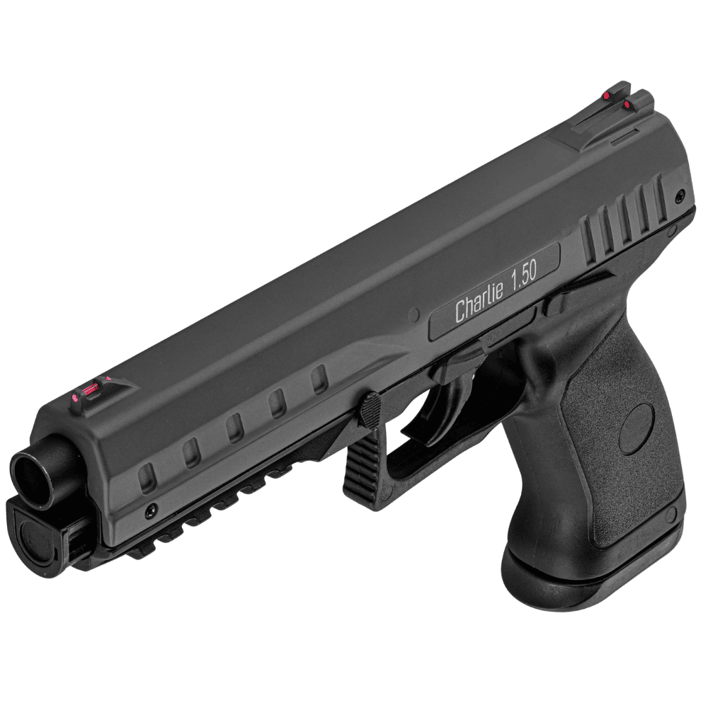 La pistola Charlie 1.50 es un arma de autodefensa de alta potencia (20 julios) con un aspecto imponente. Con su corredera y cañón de metal, el arma es pesada y cómoda en la mano como una pistola real.