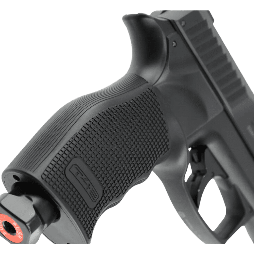 Funciona con cápsula CO₂ de 12g y ofrece capacidad de 6 rondas en cargador tubular. Su energía de 13 joules proporciona mayor impacto, mientras que el seguro automático del gatillo y su diseño ergonómico garantizan un manejo seguro.