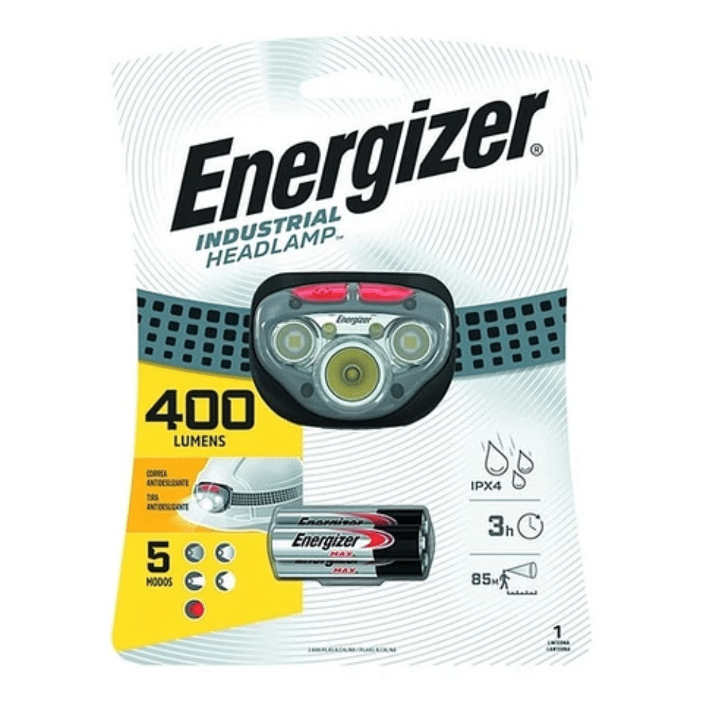 Linterna frontal energizer 400 lumens MANOS LIBRES INDUSTRIAL 400 LUMENS CON CABEZAL PIVOTANTE, LED BLANCO Y ROJO PARA VISIÓN NOCTURNA. FOCO DIGITAL CON 5 FUNCIONES . CORREA CON DORSO DE SILICONA PARA AGARRE ANTIDESLIZANTE. BLISTER CON 1 LINTERNA Y 3 PILAS AAA